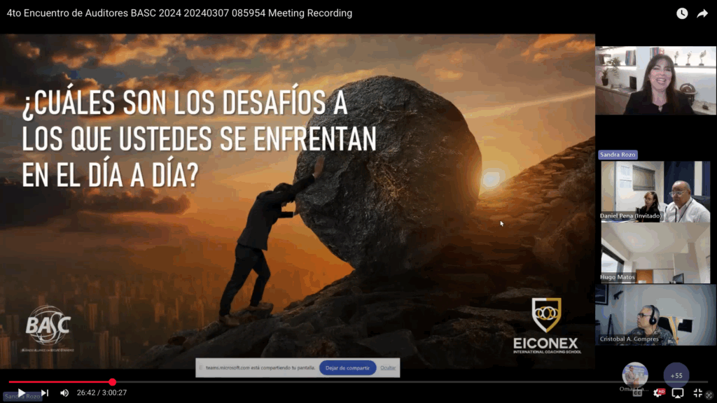 La primera ponencia estuvo a cargo de Sandra Rozo, presidente de EICONEX Internacional, resaltó en su ponencia la importancia de las habilidades blandas en las competencias del auditor interno BASC, afianzando el termino de “transformación” desarrollando temas como enfoque a evidencias, no a las personas, generar confianza, el arte de preguntar sin juzgar, la gestión emocional, la escucha activa, la empatía y comunicación asertiva. Igual resaltó la importancia de negociación de conflictos como enfoque principal de la gestión en las validaciones de los procesos de auditorías.