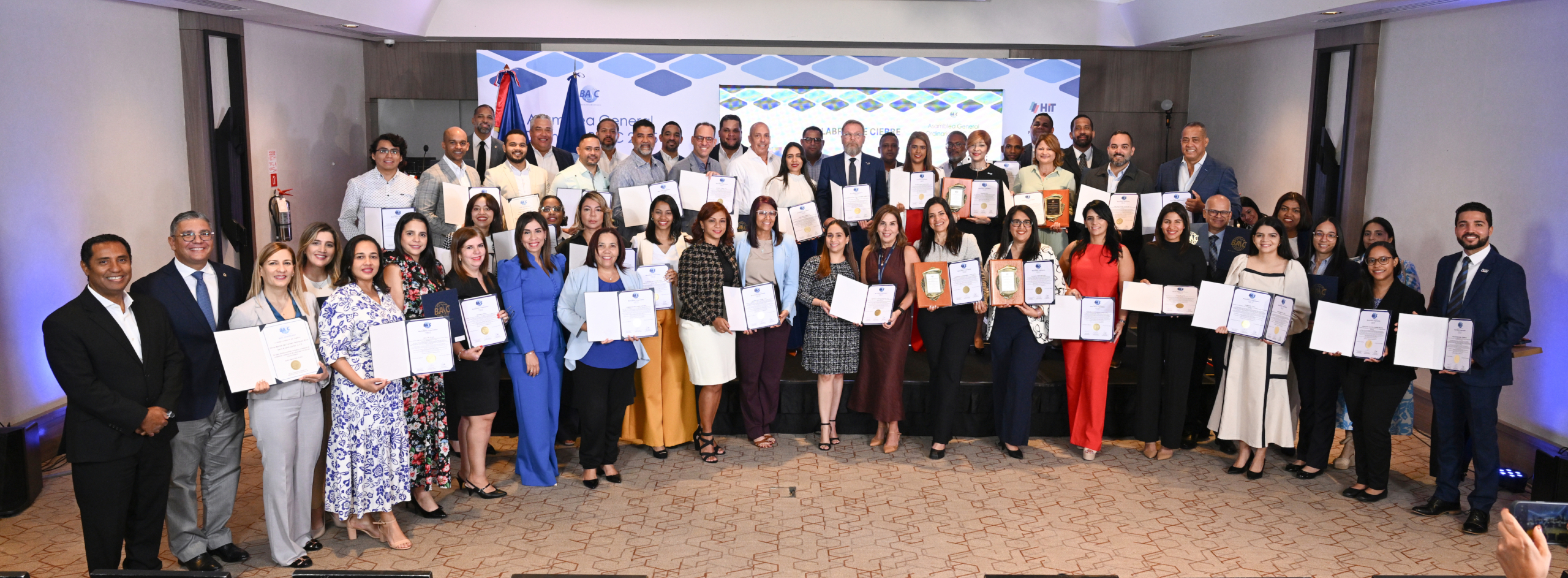 La Ceremonia de Entrega de Certificados estuvo encabezada por el presidente de BASC Dominicana, el Sr. Horacio Lomba, junto a Odile Miniño, Ricardo Seravalle presentantes de la Junta Directiva y el señor Abdías Ortiz, agregado regional del Caribe de las Aduanas y Protección Fronteriza (CBP) del Gobierno de Estados Unidos.