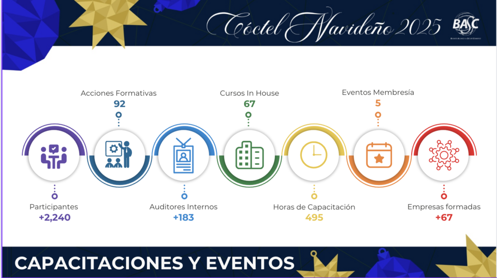 En cuanto al área de capacitaciones y eventos, el capítulo alcanzó un total de 92 acciones formativas, donde asistieron más de 2,240 colaboradores de empresas BASC duplicando el numero del año pasado, con la participación de instituciones gubernamentales y asociaciones relacionadas al sector. Se formaron 183 nuevos auditores internos en la Norma Internacional BASC Versión 6 2022, y como parte del compromiso y los beneficios para la membresía, realizamos 5 eventos temáticos y de networking.