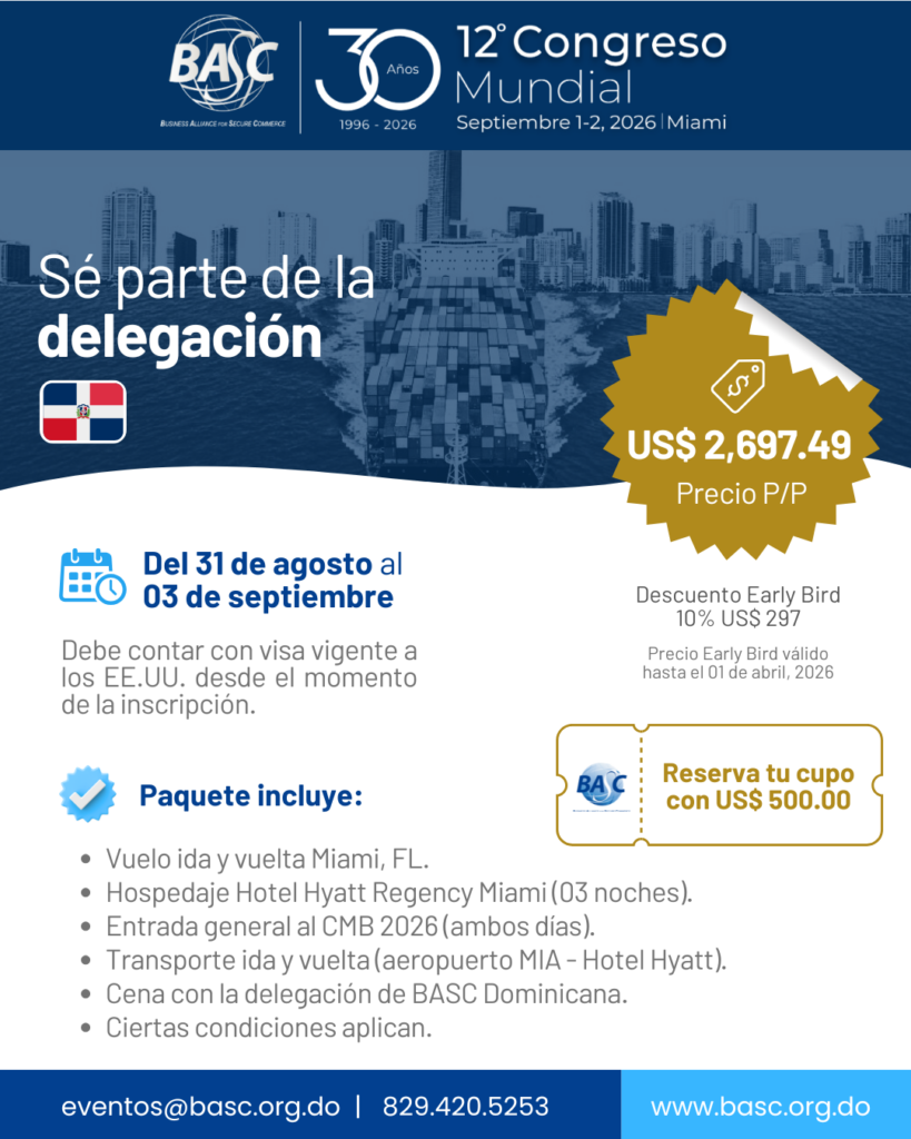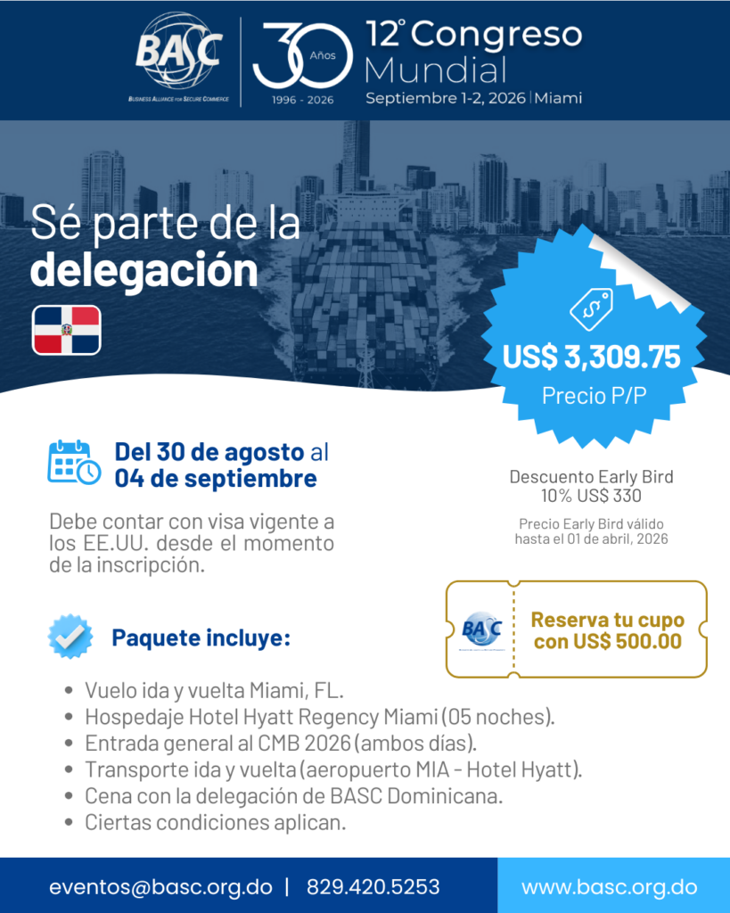 BASC DOMINICANA invita a toda su membresía al 12º Congreso Mundial BASC“Asegurando el Comercio, Fortaleciendo la Confianza” que se celebrará en Miami los días 1 y 2 de septiembre de 2026.  El Congreso es el foro por excelencia que reúne a importantes e influyentes líderes del sector privado y público de las Américas, y a expertos del mundo, con el objetivo de fortalecer la seguridad y la confianza en la cadena de suministro global. Este evento marcará la celebración de los 30 años de la Business Alliance for Secure Commerce – BASC, es por esto que el capítulo de República Dominicana ha preparado estos paquetes especiales para su membresía.