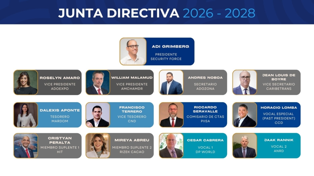 La nueva junta directiva de BASC Dominicana para el período 2026-2028 que preside Grimberg, representante de Security Force, empresa de seguridad privada, miembro fundador del capítulo y certificada por mas de 18 años; está conformadas además, por William Malamud de AMCHAMDR, como vicepresidente y miembro vitalicio; Roselyn Amaro 2do VP en representación de ADOEXPO, miembro fundador por igual. Andrés Noboa en la posición de secretario, en representación de ADOZON. Asimismo, Riccardo Seravalle asumió como comisario de cuentas, en representación de PIISA Industrial Park, mientras que Jean Louis De Boyre en representación de Caribetrans como vicesecretario.
