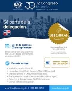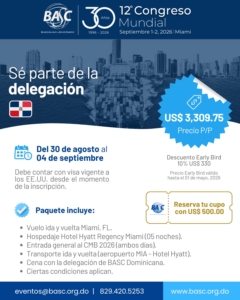 BASC DOMINICANA invita a toda su membresía al 12º Congreso Mundial BASC: “Asegurando el Comercio, Fortaleciendo la Confianza” que se celebrará en Miami los días 1 y 2 de septiembre de 2026. El Congreso es el foro por excelencia que reúne a importantes e influyentes líderes del sector privado y público de las Américas, y a expertos del mundo, con el objetivo de fortalecer la seguridad y la confianza en la cadena de suministro global.