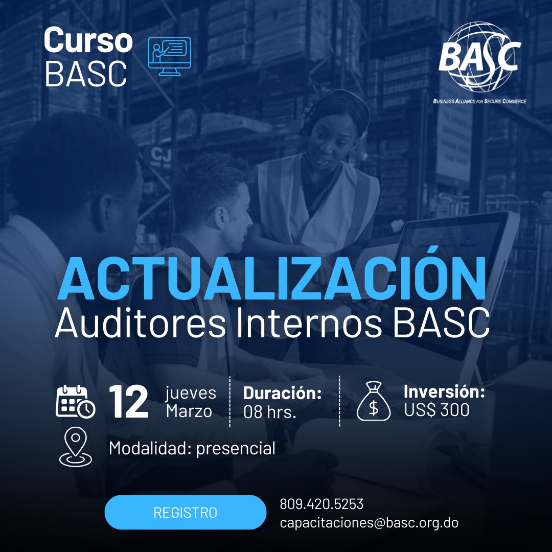 El Capítulo BASC Dominicana invita a toda su membresía a participar en la 1ra ”Actualización de Auditores Internos BASC V6-2022” del 2026. A ser impartida el Jueves 12 de Marzo, 09:00 A.M. a 5:00 P.M. Modalidad presencial.